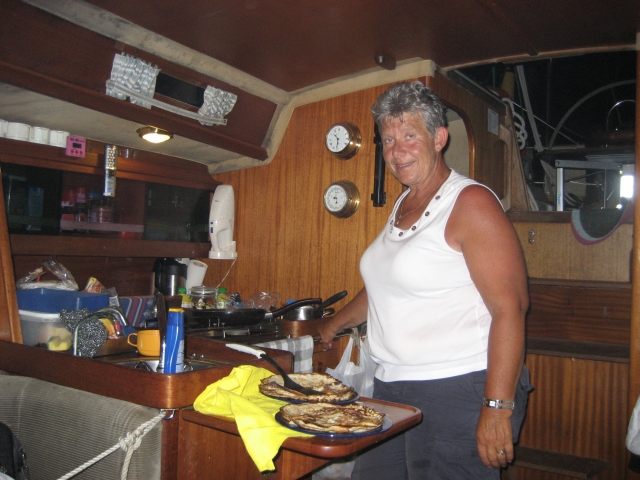 Dus naar boven de mast in, inclusief de periodieke inspectie van de mast en van alle fittings bovenin. Toplicht doet het weer. Frouk scoort een nieuwe LED lamp die we voorop installeren. Die doet het ook weer. Angèle maakt ondertussen een lunch met vers stokbrood en paté de pato, met een glaasje koele witte wijn er bij. De tijd vliegt voorbij en om 14:00 stappen we in de taxi naar het vliegveld. Alles gaat daar vlot en we hebben nog tijd voor een broodje en een colaatje op de luchthaven. Angèle meldt later dat ze precies op tijd zullen vertrekken en een paar uur later dat ze weer veilig is geland op Schiphol. Michiel en Frouk bestuderen die avond de weerkaarten, GRIB files en weersvoorspellingen voor het vervolg van de reis van de Pas de Deux, via Menorca, naar Corsica.
